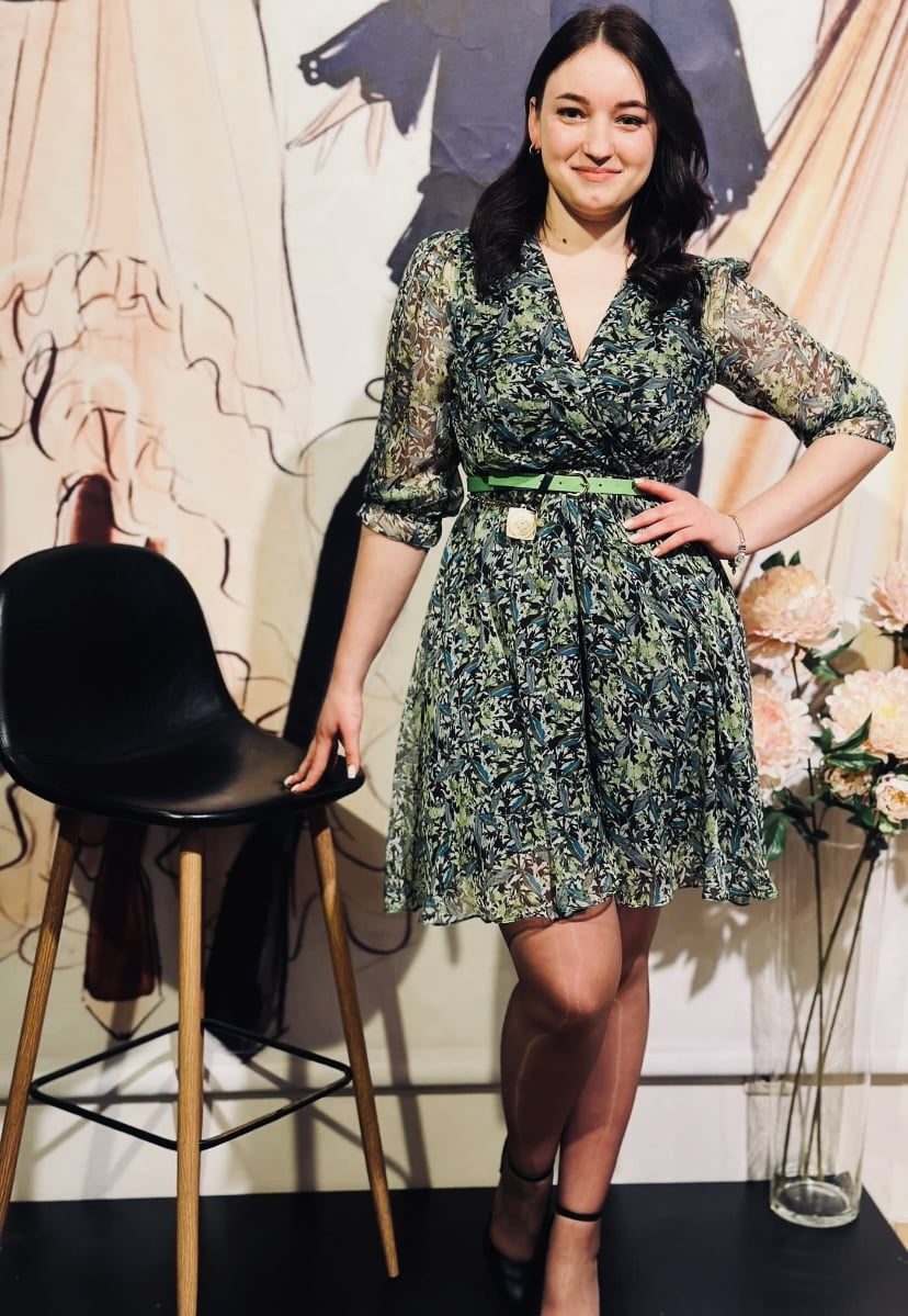 Lengvo stiliaus trumpa suknelė su V formos kaklo iškirpte. Suknelė su dirželiu, rankovės 3/4